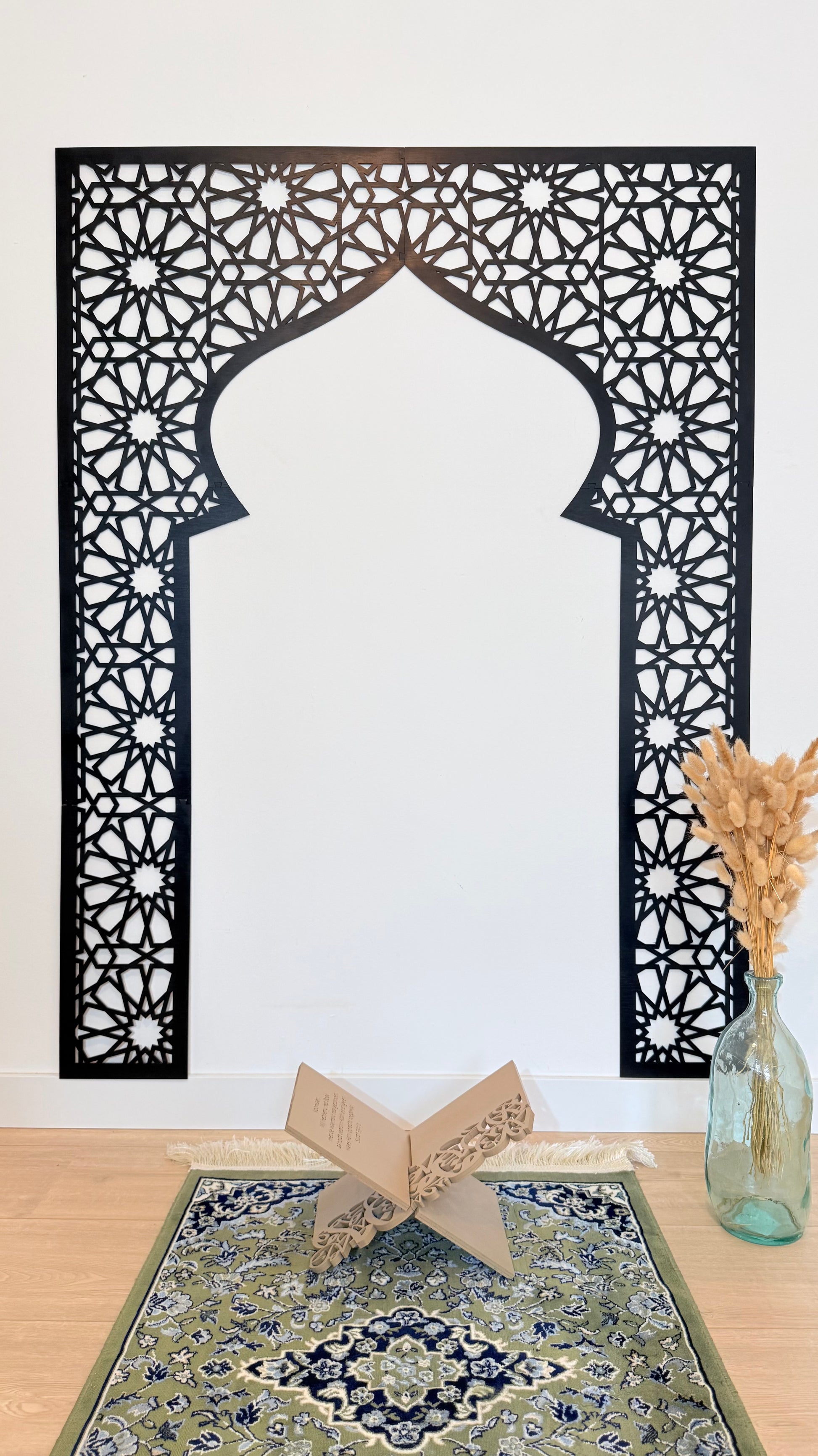 Breng een spirituele en elegante sfeer in huis met deze prachtige Mihrab wanddecoratie. Het ontwerp is geïnspireerd op traditionele islamitische architectuur en verfijnde geometrische patronen. De sierlijke boog symboliseert de mihrab, de gebedsnis die de richting van de Qibla aangeeft.